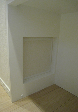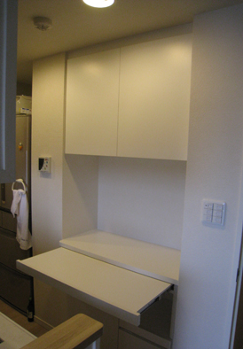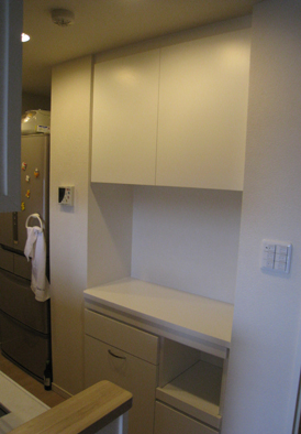 左右の壁の奥行きが異なる設置スペースでした。上の吊り収納は浅い奥行きに、下の収納は深い奥行きに追わせて作成いたしました。吊り収納上部耐震ラッチ付きです。