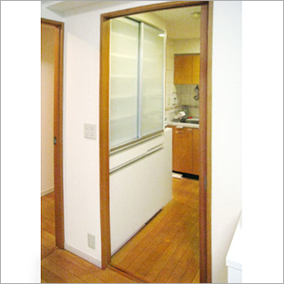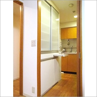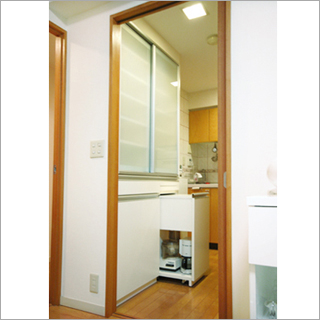 お客様のキッチン家電を収納するワゴンがぴったり収まっています。ワゴンを引き出し、上部の蓋を開けると中の精米機が使用できるようになっています。内寸を確保するため戸枠を避けるなど、細かくサイズに対応いたしました。