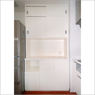 上部の食器収納部を引き違い扉にしています。開閉スペースを取らないので、食器の出し入れが簡単です。壁のコンセントを家具の前面に移設しています。カウンター高さは右のキッチンの収納高さとあわせて連続感を持たせています。